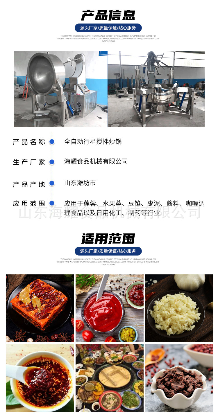 詳細信息 訂貨號XXCG-1000 加工定制是 貨號XXCG-1000 種類行星炒鍋 品牌海耀 型號100-1000型定制 電壓380(V) 功率4(kw) 凈重150(kg) 包裝纏繞膜 外形尺寸定制(mm) 產(chǎn)品用途醬料 炒菜等 適用范圍肉制品加工廠設(shè)備,冷凍食品廠設(shè)備,中餐店設(shè)備,休閑食品廠設(shè)備,西餐店設(shè)備 營銷新品 規(guī)格定金,尾款 主要下游平臺