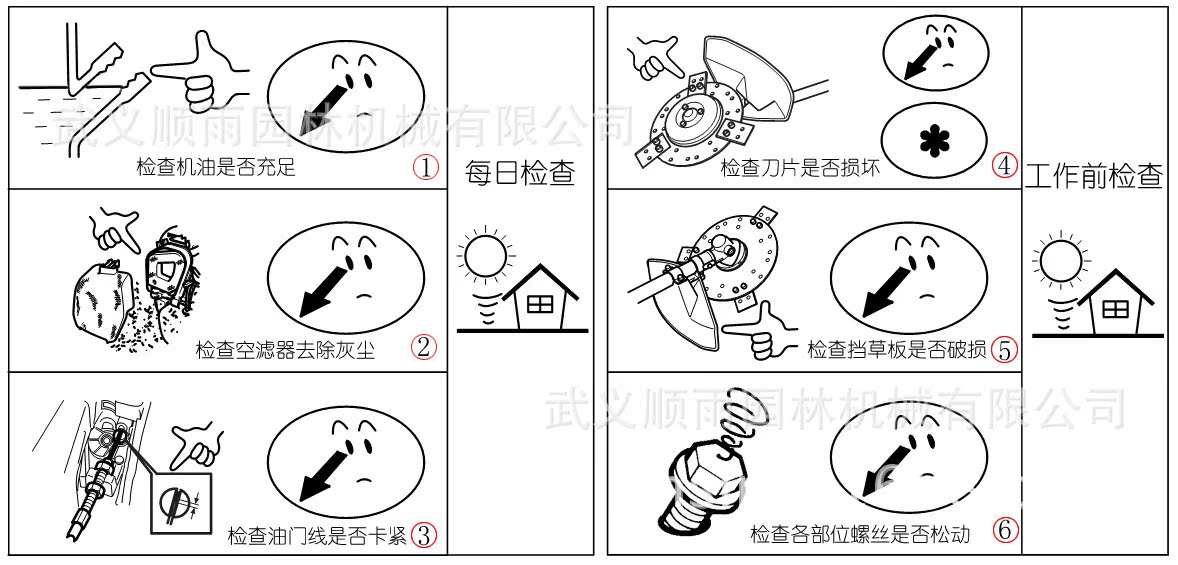 1.發(fā)動(dòng)機(jī)啟動(dòng)前請(qǐng)檢查刀片刀具是否安裝牢固,每次工作后要檢查刀片刀具是否完好。啟動(dòng)發(fā)動(dòng)機(jī)時(shí),人員需遠(yuǎn)離10米以上。