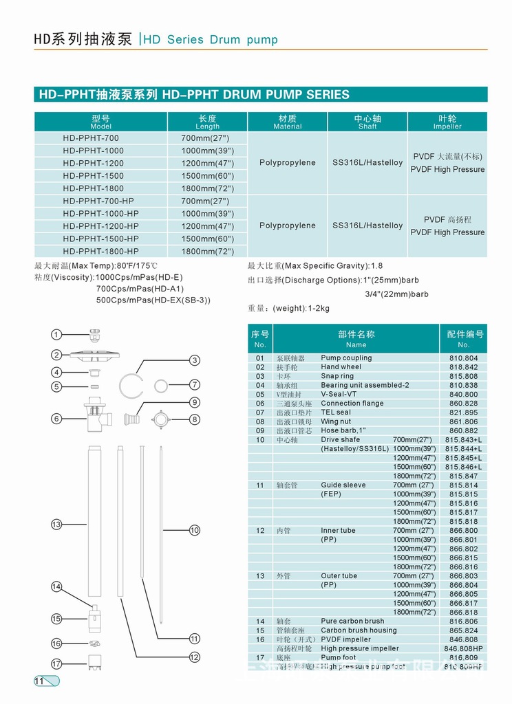 HD插桶泵有8個(gè)系列泵管,普通電機(jī),TEFC全封閉風(fēng)冷電機(jī)、防爆電機(jī),調(diào)速電機(jī),氣動(dòng)馬達(dá)滿足不同的應(yīng)用場(chǎng)合;AL,PP,CPVC,PVDF,PTFE,SUS30408,SUS316L,以及符合食品應(yīng)用的多種材質(zhì)適合不同的介質(zhì)。