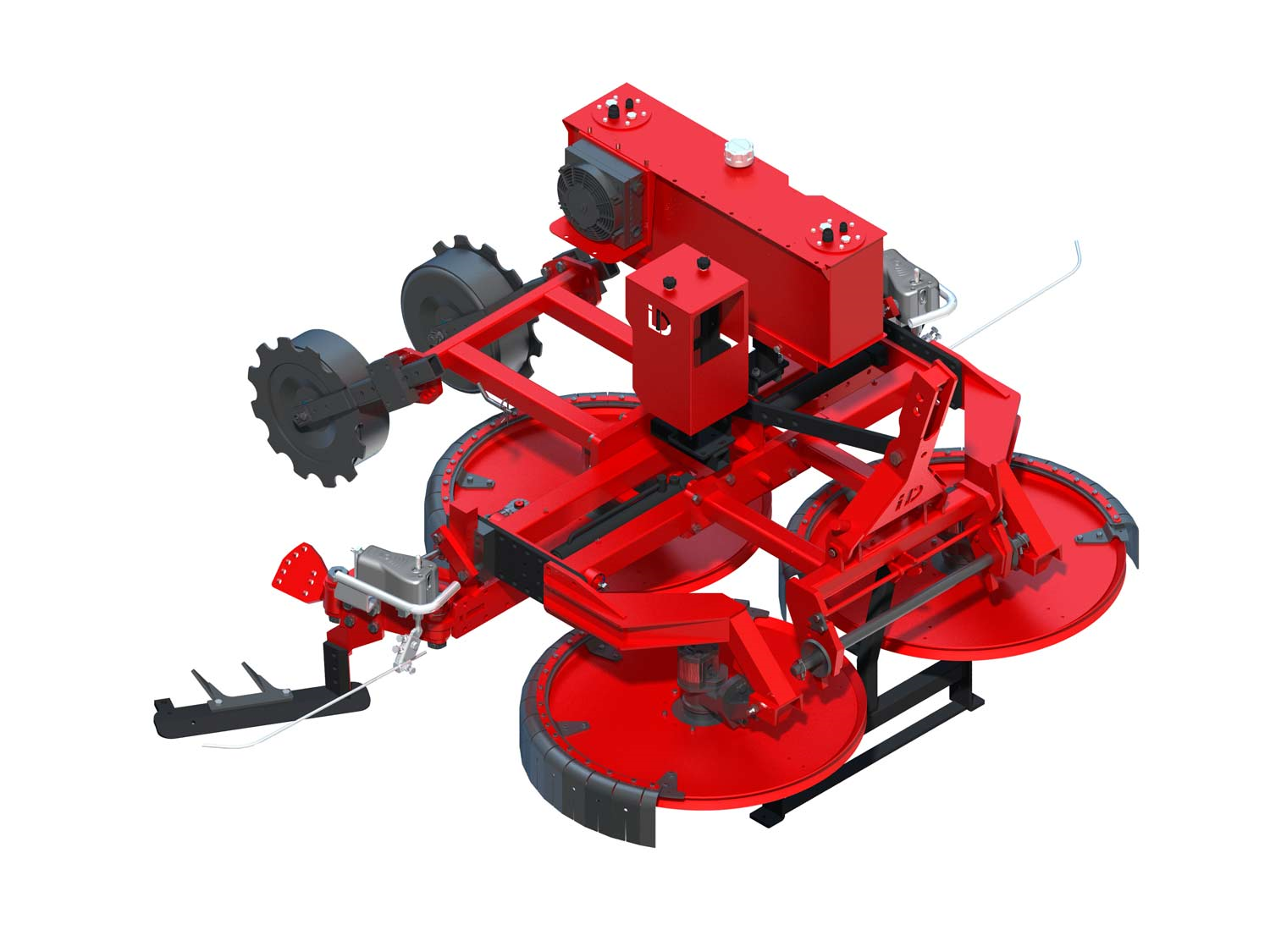 用途:主要針對果園行間鋤草,以及株間鋤草、松土、旋耕等作業(yè),可以實現(xiàn)行間和株間聯(lián)合作業(yè),真正的一機多能。五個獨立作業(yè)單元全液壓馬達(dá)驅(qū)動,具有自浮動仿地形功能,適合多種地面工況;作業(yè)寬度可根據(jù)實時行距液壓調(diào)節(jié),左右兩側(cè)獨立單元可以換裝割草圓盤、松土鋤頭、鋤草立旋和覆土翻轉(zhuǎn)犁等多種株間作業(yè)機具;左右兩側(cè)工作單元自帶障礙物觸點自動回彈裝置;自帶大容量油箱和散熱風(fēng)扇;單柄電控操作。