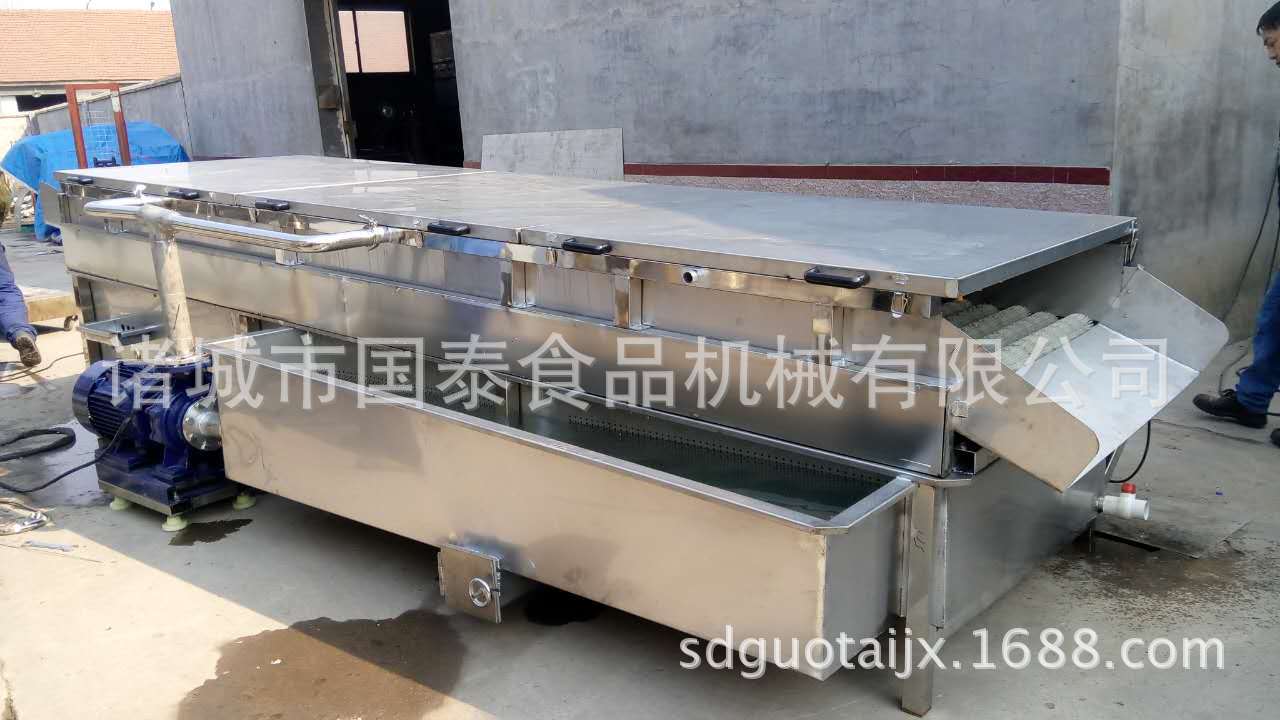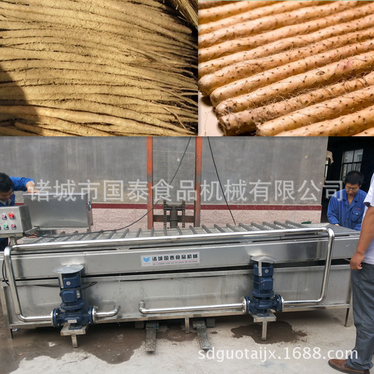 山藥毛輥清洗去雜機采用SUS304不銹鋼制做,設備上部有高壓噴淋對果蔬表面進行沖洗可有效的洗去表面粘有的泥沙、中間有毛輥,通過毛輥的轉動帶動果蔬的前進,并對物料的表面進行刷洗可深層清洗果蔬表面粘連的不易沖洗的雜物,毛輥采用雙層毛刷可以將表面的毛發和纖維物的清除。經毛輥清洗去雜機去除毛發及纖維雜物后,提高了果蔬的潔凈率。下部可進行水收集使之能循環利用,節約了成本。