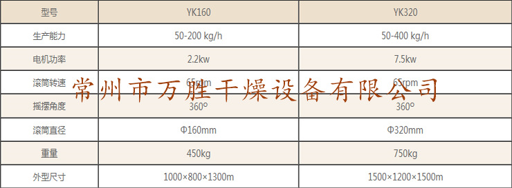 詳細信息 訂貨號CZWSYK01 加工定制是 貨號CZWSYK01 品牌萬勝 型號YK-160型 適用物料多種可用 應用領域食品 化工 制藥 傳熱面積0(m2) 轉速24(r/min) 功率3(kw) 外形尺寸0.7*0.8*1.28(m) 重量280(kg)