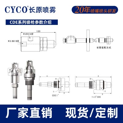 CDE系列噴槍的標準材質:316不銹鋼鈷合金耐磨護套。如需其他材質,請注明管徑、連接方式、噴嘴號、噴霧角度和材料。